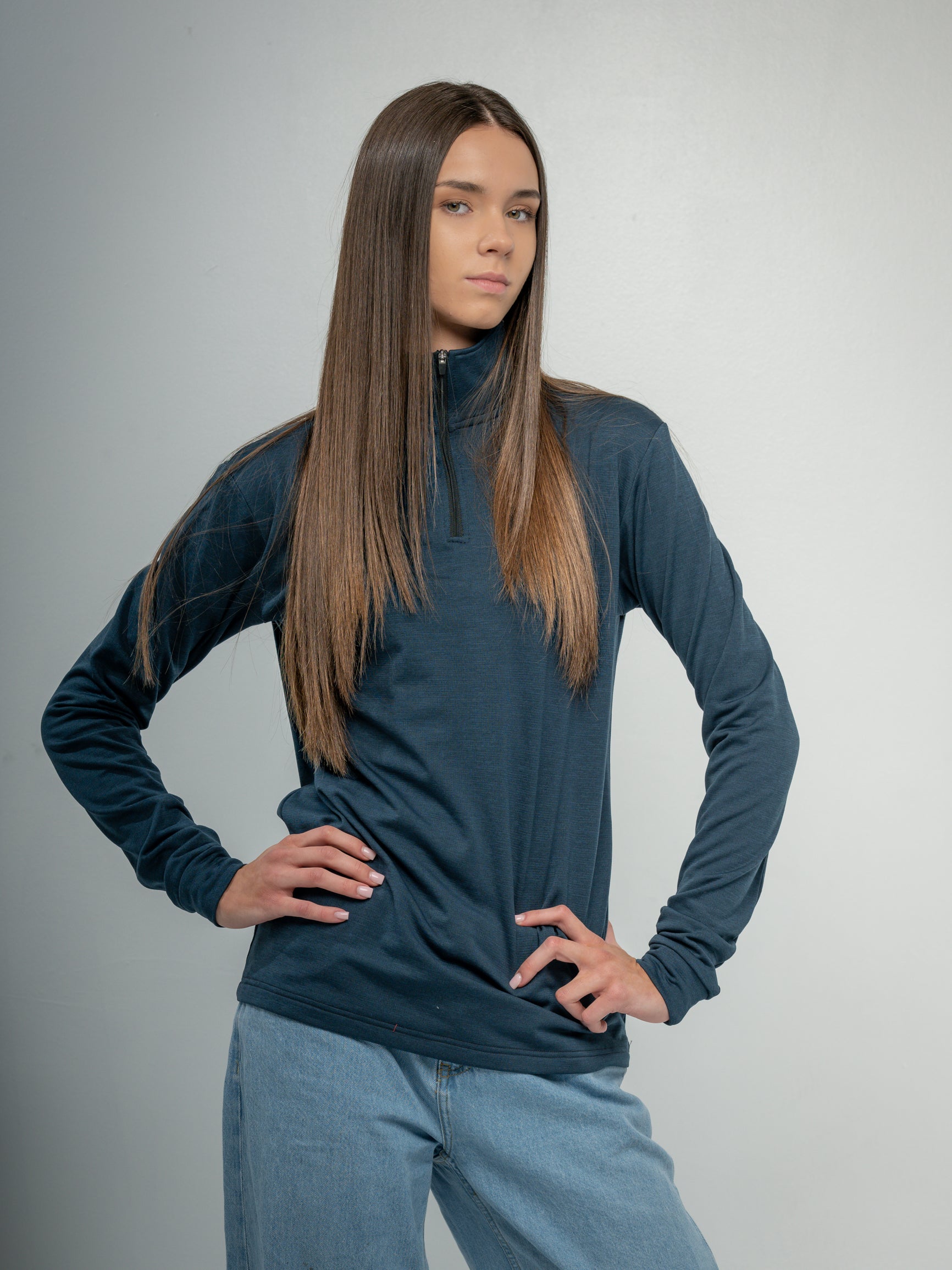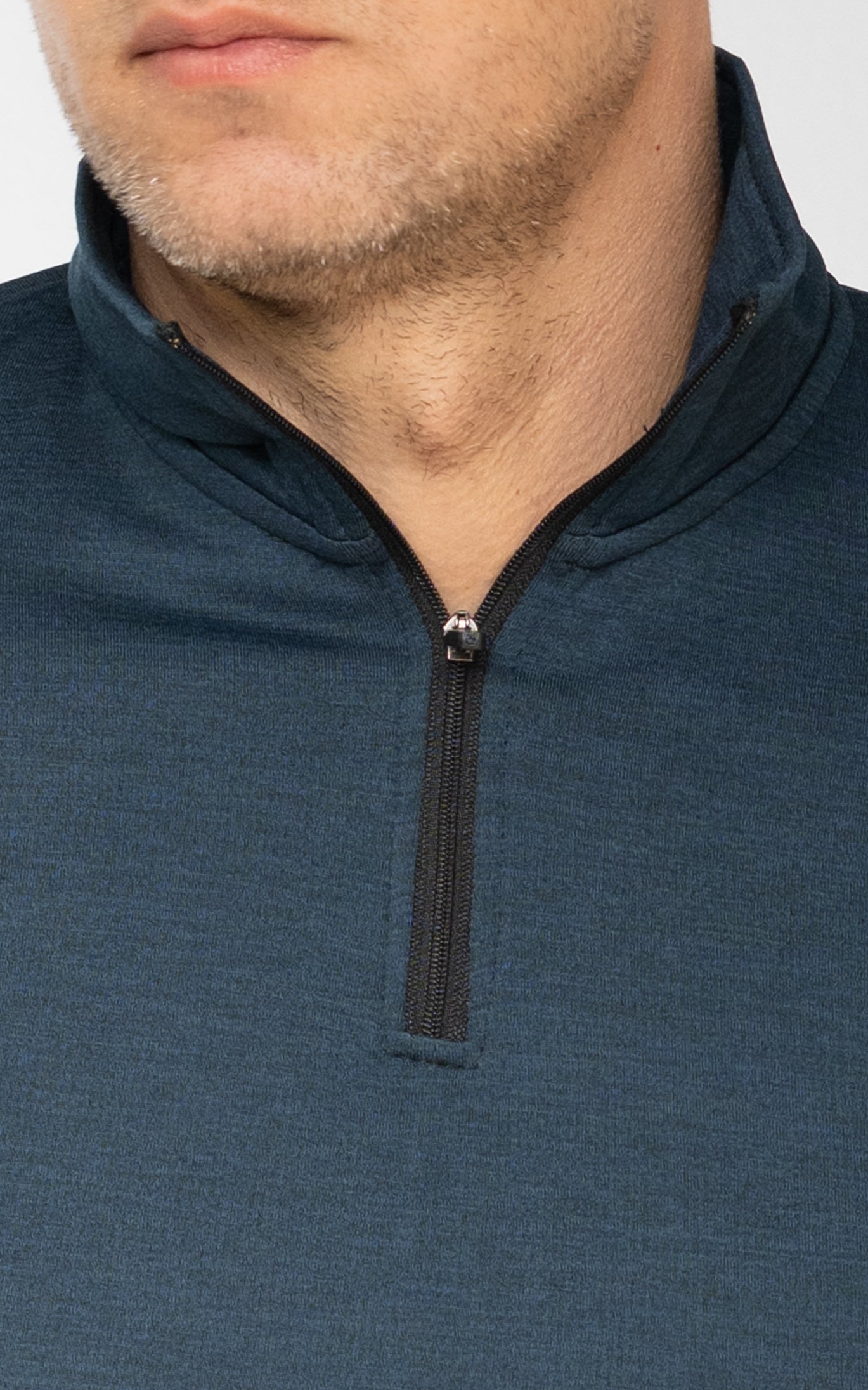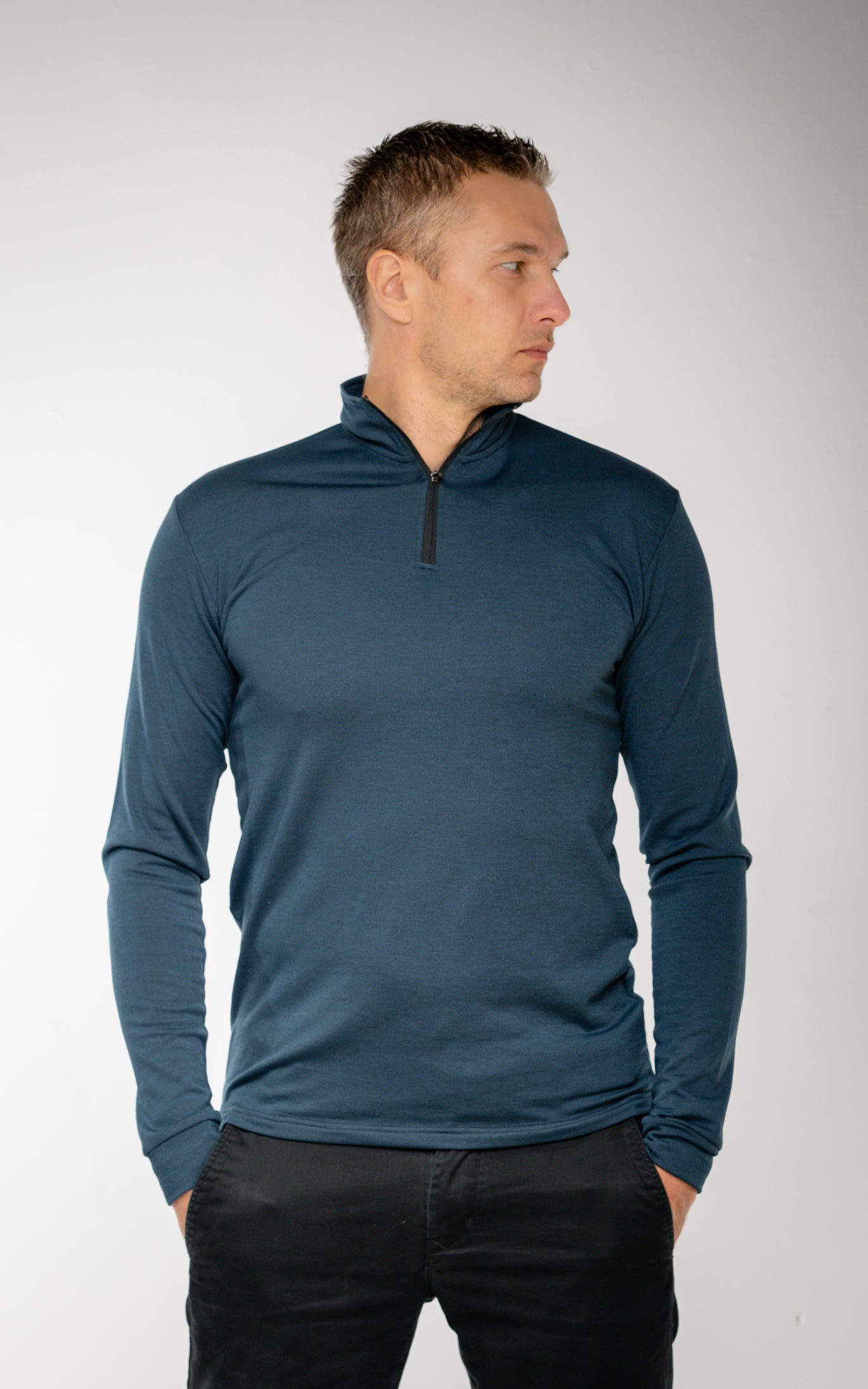 The closer fit supports mobility and a clean athletic look, while the 1/4 zip high neck allows temperature control during changing conditions. This is a functional piece first—clean, sharp, and purpose-driven.